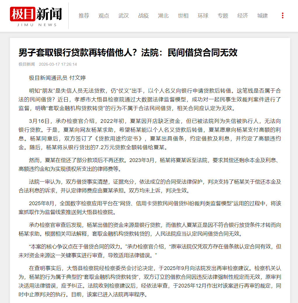 在查明事实后,大悟县检察院经检察委员会讨论决定,于2025年9月向法院发出再审检察建议。检察机关认为,杨某的行为属于典型的“套取金融机构贷款转贷”,双方订立的借款合同因违反法律强制性规定而无效,原审判决适用法律错误,应予纠正。法院收到检察建议后,经依法审查,于2025年12月作出对该案进行再审的裁定,同时中止原判决的执行。目前,该案已进入法院再审程序。